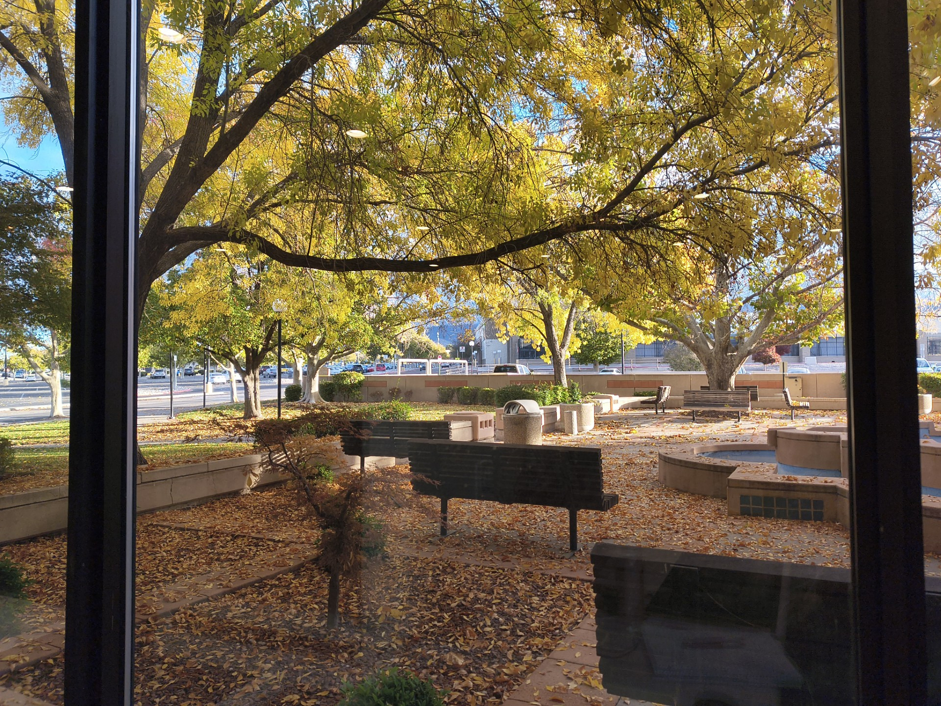 My current chair looks out on a small patio for the building. Beyond that is our parking lot, and beyond that is a Walmart. If I crane my neck a little, I can see the northern end of the Sandia Mountains.